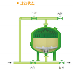隨時雜質(zhì)在濾料層中不斷聚積,壓力損失不斷增加,當壓差增加到某一設(shè)定值時或到達設(shè)定的清洗時,系統(tǒng)將自動轉(zhuǎn)換至反洗狀態(tài)。加壓水通過集水裝置進入濾料層,對其進行沖刷,使截留的污染物脫落并排出過濾系統(tǒng)。反洗持續(xù)至少2分鐘后,閥門自動將系統(tǒng)轉(zhuǎn)至過濾狀態(tài)。